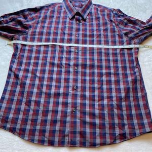 Untuckit Plaid Pomerol Button Down Shirt Size XXL Slim Fit. Excellent pre-owned condition. Blue, maroon and gray plaid color. 100% cotton. Measures approximately chest 50", length 30", sleeve 26".