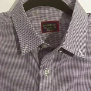 This Untuckit shirt in a stylish purple checkered print is made of wrinkle-free cotton for easy care. The slim fit design flatters the figure and features long sleeves, making it perfect for any occasion. Sized XL for big and tall men, it is a versatile addition to any wardrobe. The shirt is a button-up style and made of high-quality cotton for maximum comfort. The features include a slimming effect and the brand is UNTUCKit. It is ideal for casual settings and can be worn with jeans or dress pants.
