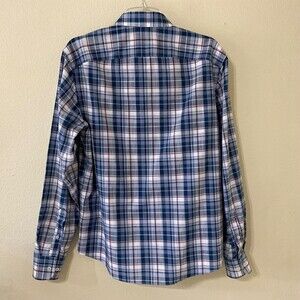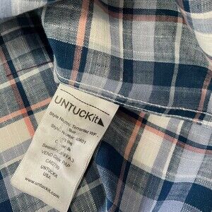 Very good pre owned Untuckit Terrantez Wrinkle Free Mens size Medium Button Up Long Sleeve shirt blue plaid thin stripes are pink. Has two extra replacement buttons.