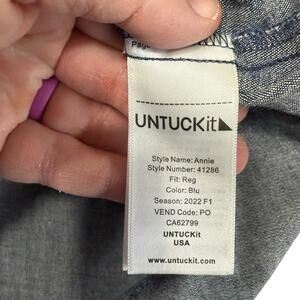 This Untuckit Women’s Sz 10 Denim Shirt Dress in a dark wash blue color is a versatile and stylish piece that can be worn for various occasions. The button front closure, long sleeves, and collared neckline give it a classic western look, perfect for casual, business, or travel settings. Made from a blend of spandex and cotton denim, this knee-length dress is comfortable to wear and easy to care for with its machine washable feature. Additionally, the dress has pockets and a solid pattern, making it a practical and fashionable choice for the seasons of summer, fall, and spring.