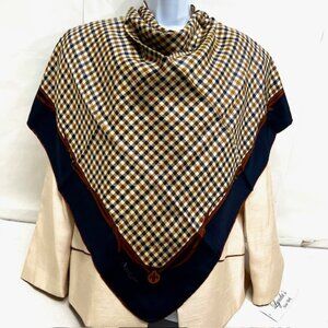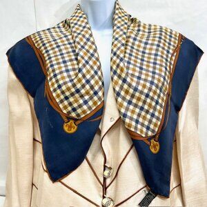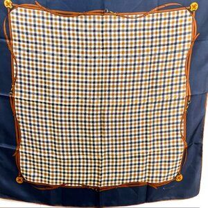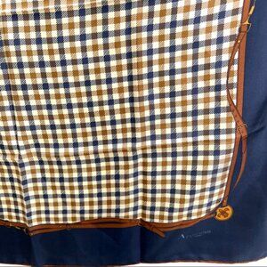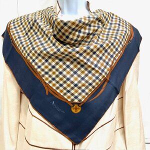 Unused Aquascutum of London 100% silk scarf, made in Italy. The scarf features a blue Nova check pattern, with accents of the brand's logo. Measuring 31"x31" it is designed as a square scarf and is suitable for both men and women.