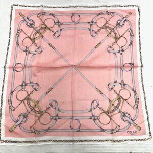 #62 New Unused Celine Paris Mini Scarf/Handkerchief Cotton 18" Square ,made in Japan, color Pink Gray Gold Chain with white trimp and logo