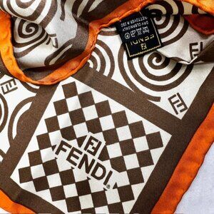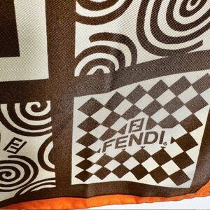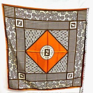 Unused Fendi 100% Silk Scarf Satin 34"x34 Ivery Brown Orange Made in Italy (22)