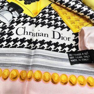 The scarf comes in a beautiful color light pink gold black white perfume bottle with Miss dior in middle black undertone made in Italy, making it a versatile accessory must-have for any woman's wardrobe wanted.