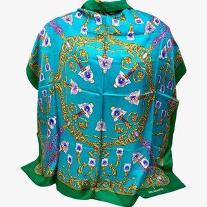 #40 Beautiful Unused TRUSSARDI large square scarf is a luxurious accessory made of 100% silk satin 34"square . Featuring a teal green and gold urple color glaseses scheme with an artistic design, this vintage piece exudes elegance and style. Perfect for all seasons, this scarf can be worn in various ways to add a touch of sophistication to any outfit. Made in Italy,