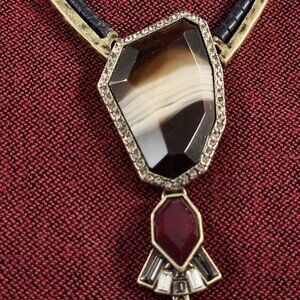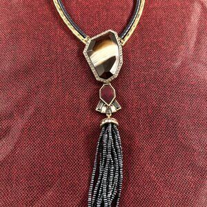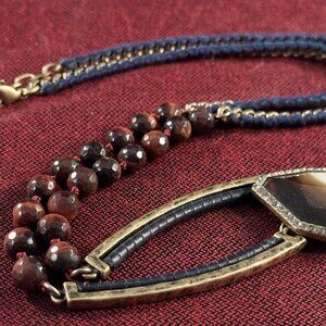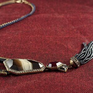 This is a unique and unusual Chloe + Isabel signed necklace. Chain is 22" long, has a 2" extender. Gold chain has some navy blue suede stitched on to it. It is followed by faceted Tiger Eye beads that are individually knotted. Then gold metal with a black leather like trim. Hanging from this necklace is a faceted banded Agate gemstone, it is surrounded by little Rhinestones. Dangling from this is a deep red faceted crystal, followed by Art Deco style set rhinestones and a 2.5" micro black glass bead tassel.