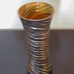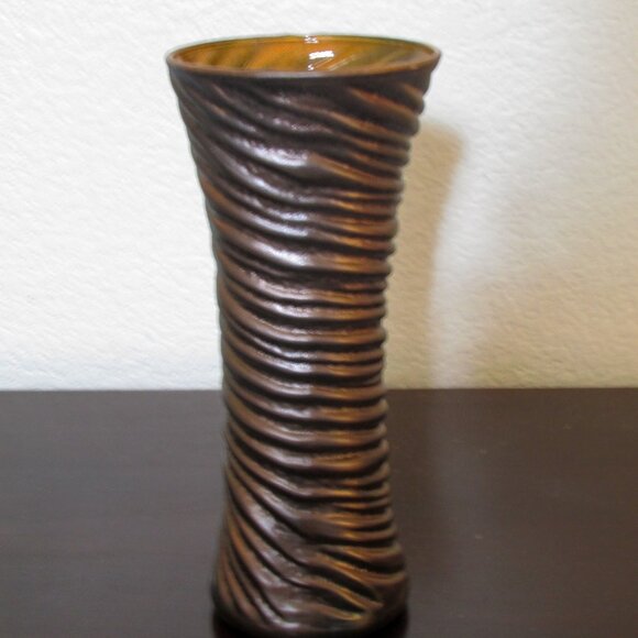 Unusual Large Textured Glass Vase with Bronze Finish and Orange Interior 9" x 4"