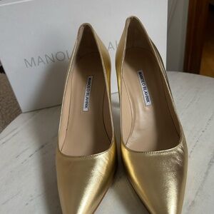 Iconic Manolo Blahnik BB pumps in glamorous gold leather, unworn from an exclusive sample sale! Size 38.5 (US ~8.5), these 105mm heels are in excellent condition with a minor 1-inch scratch on one shoe (barely noticeable, uncolored). Comes with a Manolo Blahnik box (note: not the original box for this pair, but an authentic Manolo box). Retail ~$795. Perfect for parties or adding sparkle to any outfit. A classic style at a steal—grab these before they’re gone! Fast shipping. #ManoloBlahnik #BBPumps #LuxuryFashion