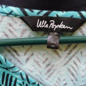 Unworn tunic. Size 16-18. V-neck, 3/4 sleeves. Shoulder 17 ins, bust 48 ins, length 30.5 ins, sleeves 17.25ins. Turquoise & navy with stylized leaves. 100% cotton, made in India. Machine wash delicate.