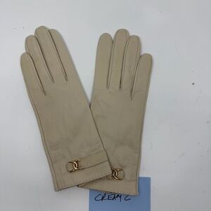Unworn, Absolutely light as air, silk lined , soft kidskin ladies glove , wrist length, size 6 1/2. Made by Barnier in France who made private label gloves for famous French design houses. We visited Paris in 1970's with Sara Middleman, the couture buyer for Saks Fifth Avenue and had an opportunity to buy the exact same gloves that were made for Famous Couture houses. These are a deeper parchment/vermouth/cream. Size 6 1/2 ( a woman's medium) These have gold tone CC, slight tarnish from age. The stitching is outstanding. These are unused, in pristine condition. Marked Made in France, Chevreau Garanti. Silk Lined.