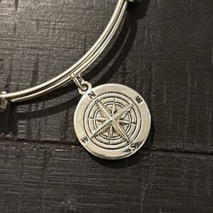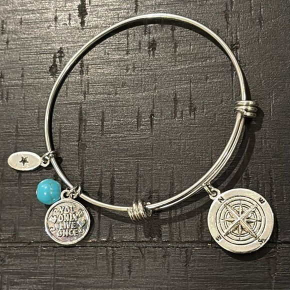 Silver charm bracelet featuring a globe charm and compass charm. Saying charms