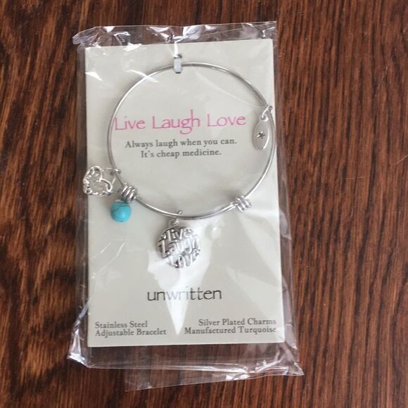 Charms say, “Live Laugh Love,” “XOXO,” and “unwritten” on one side and a star on the other side. The bracelet is stainless steel and features a manufactured turquoise bead and silver plated charms