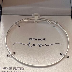 Symbolic style that's oh-so trendy. This chic sideways cross bangle is set in sterling silver and features a catch hinge clasp. The inside of the band reads "Faith Hope Love".