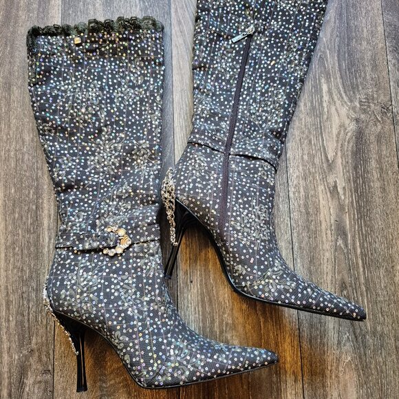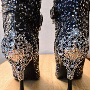 Stunning Unze London high-heeled boots covered in shimmering sequins with an ornate crystal-encrusted heel design. These boots are a true statement piece — elegant, glamorous, and beautifully detailed from every angle. Perfect for evening wear, events, or anyone who loves unique luxury footwear.