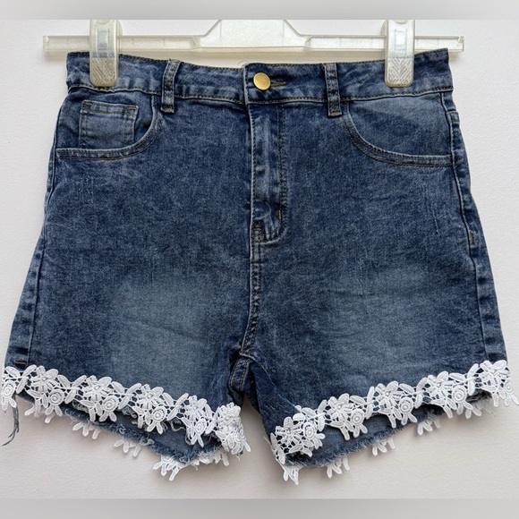 Up-Cycled Blue Denim and White Jean Shorts with Lacy Trimmed Frayed Hem