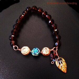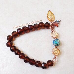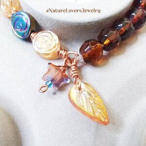 Cognac brown faceted glass beads and a dangling star +++ warm yellow flower beads + leaf charm +++ electroplated blue floral bead +++ copper wire wrapping.