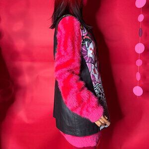 Fall down the rabbit hole in style. This one-of-a-kind vest started life as a classic 1990s Danier black leather piece and was transformed by SPARK + REBEL into a wearable Wonderland trip.