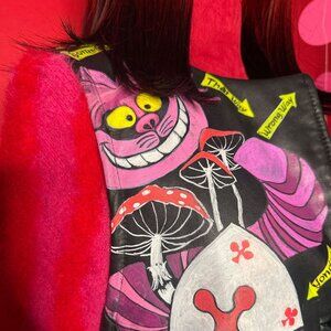 DETAILS: Featuring a hand-painted Cheshire Cat with neon eyes, trippy black-and-white spirals, and a cascade of playing cards, it’s a rebellious mix of vintage craftsmanship and modern eco-art.