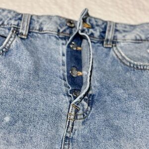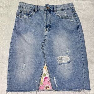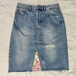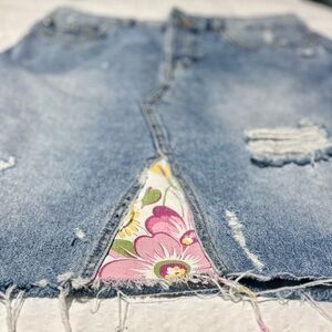 Upcycled Artisan Distressed Jean Skirt With Floral Trim, Button Fly, size 12