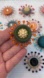 Large green button with honeycomb like center. Surrounded by sparkly orange rhinestones. Fun 70’s vibe color combination.