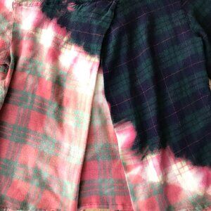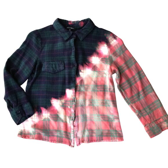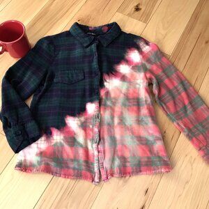 Upcycled bleached ombre flannel shirt, Junior's size medium, cropped style. This is a really cute flannel shirt that has been distress bleached on a diagonal line with a most interesting ombre effect. The colors are lovely together. There are 2 pleats in the back of the shirt from the yoke.