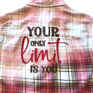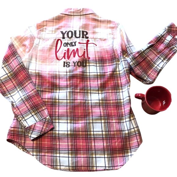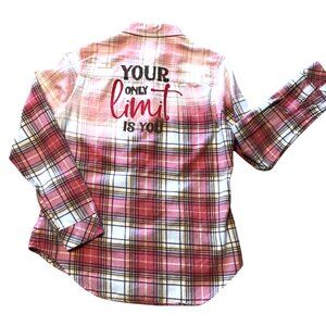This is an upcycled women's plaid flannel (size small) which has been partially bleached for an interesting effect and "Your Only Limit is You" painted onto the back. Inspire someone in your life (or yourself) to reach for the stars!