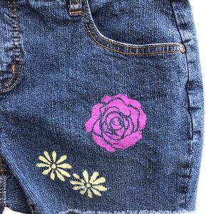 Painted cut-off denim jean shorts, women's size 8P, decorated with flowers and the words "Summer time" painted on the front. This is a cute pair of jeans that have been upcycled by cutting them off into shorts and embellishing with painted flowers. Perfect for that lakeside party or any summer outing!