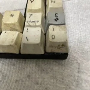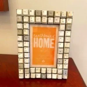 Geek Alert!! This picture frame is made from computer keyboard keys. An upcycled/recycled great addition to the Computer Geek's collection. I bought this frame at Earthbound in the early 2000's. The grime on the keys is under the glossy finish. It does not come off. I have disinfected the picture frame with spray and a cycle in a disinfecting UV light case. Please see the photos. The picture frame measures about 9 x 7 inches and holds a 4 x 6 inch photo. The original card, glass and sticker are still on the picture frame. Questions? Please ask.