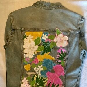 H&M Coachella up-cycled denim size US 8 with BOHO Hawaiian vibes. This piece is handmade detailed back piece with beautiful appliqués on this up-cycled jacket. It’s sure to make you show off your standout style. Inspired by the beautiful island of Maui. Mahalo.