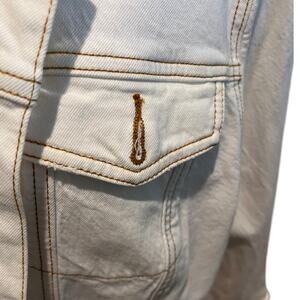 This is a CC Creations (BechNSeas brand) original creation. It is a cream/ beige colored denim jacket with a distressed hem and an open but covered lace back with embroidered floral design.