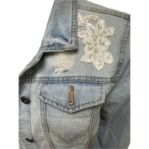 Unique upcycled denim jacket from Highway Jeans—truly one of a kind! Light wash denim with feminine touches and edgy details. Features include: