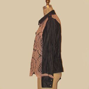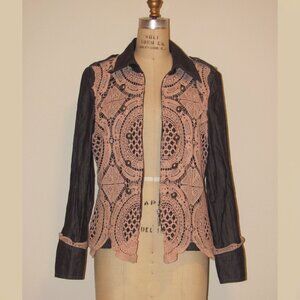 This jacket was made from a denim jacket and appliqued with a pink lace top. On the back there is a vintage earring. Jacket has a zipper front closure. Probably a small or medium. Check measurements.