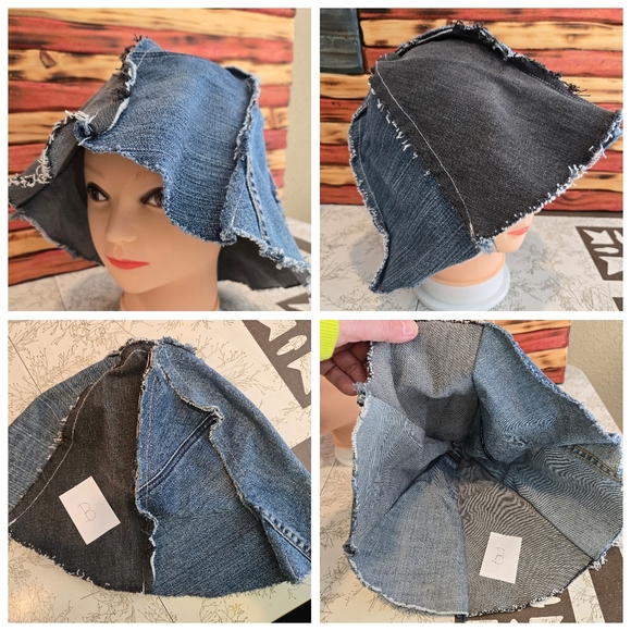 Handmade 6 panel denim hat. Made from legs that I cut off my jeans at the end of winter! I collected them for decades & finally made something. Cool frayed seams. Size M to XL. The part that sits on the head is 30", more or less. By " Don't Throw It Out ", my own brand.
