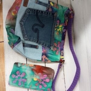 Upcycled Denim Purse Shoulder Bag with Upcycled Lining, Boho Patchwork, W/ Matching Change Purse. Approximate measurements are purse 11" x 11", strap 13". Change Purse 7" x 4".