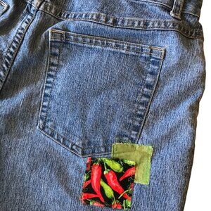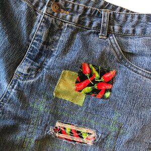 Distressed patchwork denim jean cutoffs, women's size 6. This is a cute pair of cutoff denim short shorts with distressed fringy areas in the front with chili peppers patchwork applied both front and back. What a unique, comfortable-looking pair of shorts for any fun occasion!