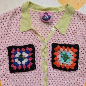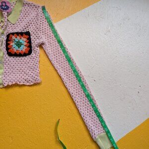 Upcycled Designer Long Sleeve Knit Granny Square Collared Crop Top Megan O'Cain