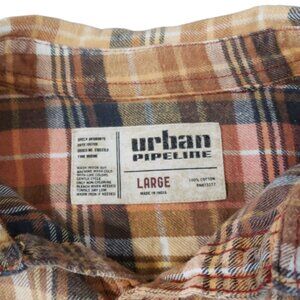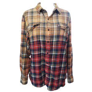 The product is a large, upcycled distressed flannel shirt with an embroidered "Fire Piranha" patch, featuring a collared neckline, long sleeves with a classic/fitted sleeve type, and a button closure. Made of 100% cotton flannel in a multicolor design, this handmade shirt is suitable for travel and casual occasions. With a regular fit, this button-up shirt is perfect for all seasons and can be machine washed for easy care. The unique style and craftsmanship make it a standout addition to any woman's wardrobe.