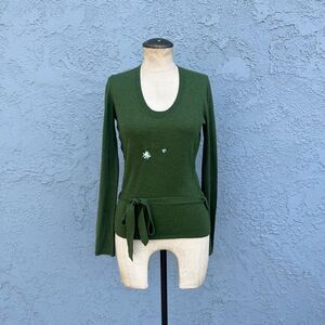 Green upcycled darned embroidered sweater. Belted. ‘S Max Mara brand cashmere. Unique eco friendly piece.
