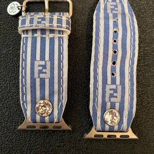 Upcycled Fendi Apple Watch band -blue pinstriped, large clear crystals, 38/40/41