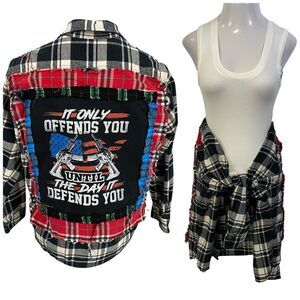 Upcycled Flannel Shirt Mens 2X Defend America Grunge Shacket Freedom Patriot Art