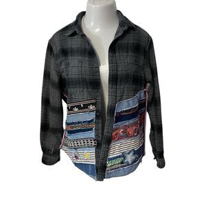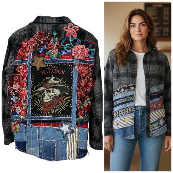 Upcycled Flannel Shirt Shacket Womens Large Skull Cowboy Jacket Grunge Patchwork