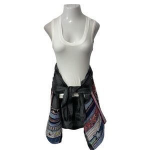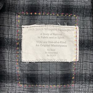This is a pre-owned, up-cycled, re-worked garment, combining a Flannel and a Tee with embellishment. It is intended to wear as a Layering Piece