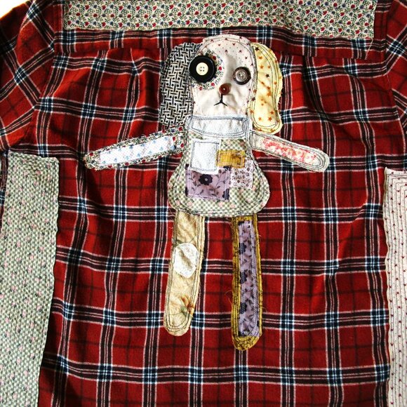 Upcycled Flannel Shirt with Patchwork Dog | Handmade Folk Art Reworked Clothing | Unique Dog Lover Gift | One of a Kind Artisan Apparel
