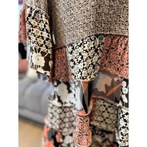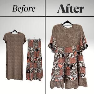 Handmade with heart and purpose, this upcycled babydoll dress is a standout in sustainable fashion. Made from a mix of rayon and polyester, it features bold exposed seams, flouncy bell sleeves, and a patchwork of floral and geometric prints. The flowing silhouette flatters effortlessly, while a 21" chest measurement and removable shoulder pads give it structure without sacrificing comfort.
