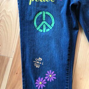 Upcycled decorated women's size 10 jean capris, embellished handmade painted boho hippie style capris with peace signs, flowers and butterflies along with the words "peace" and "love." Make a statement at your next summer outing with these cute, eye-catching, bohemian festival jean capris!