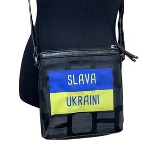 This upcycled crossbody bag purse is in excellent condition and has been adorned with a Ukrainian Flag motto. measures 8" by 8" with an adjustable 18" strap drop.