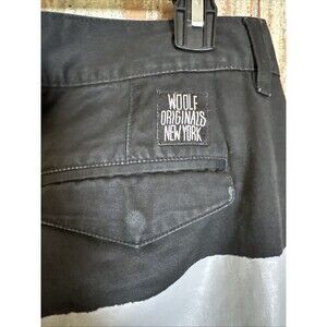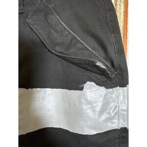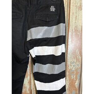 Woolf Originals New York, cargo style, black jogger pants, up-cycled into Art by Donnie Mac Wear Wowzer Trowzers. Hand painted gray and white stripes down the front of the left leg and down the back of the right leg. They are signed on the back. Not only do you get a great pair of quality pants, they are now art and completely unique. Really cool. Definitely could be unisex pants. Because the stripes are hand painted they are not meant to be perfect. Please see photos for details. The waist measures about 34 inches, inseam about 29 1/2 inches.