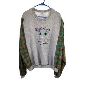 Upcycled It's All About My Cat Embroidered Oversized Sweatshirt Corduroy Flannel hand made by me. All sweatshirts, flannels. cotton button ups and t-shirts are used unless stated otherwise. This Sweatshirt is a Large but once I add the sleeve it is larger. Check measurements Below