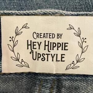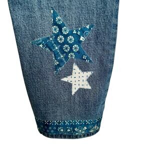 Upcycled Jeans Boho Style Patched Bleached Star Design Waist 34-36" Tapered Leg. Some distressing on original jeans remains. These jeans started life as a pair of men's straight leg jeans. Using various prints from my personal collection of fabrics, I've added patches in blues and whites as well as star appliques. The waistband and the hemline have added fabric embellishment. The waist is adjustable from 34 to 36", with an added button for the smaller waist size The pockets are deep, being mens jeans originally, and they may fit looser than women's jeans. Compare your favorite jeans with the measurements included below. These are one-of-a-kind, art-to-wear jeans.