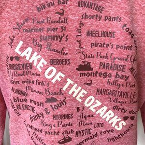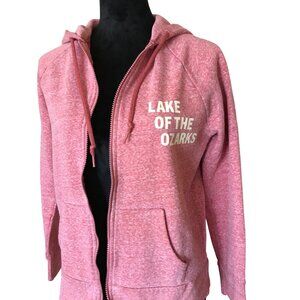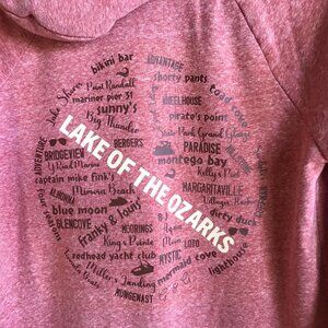Lake hoodie, size M (8-10), with Lake of the Ozarks graphics containing names of various marinas and landmarks. This is a recycled pink sweatshirt hoodie with full front zipper to which LOZ graphics have been applied in brown and light tan. This sweatshirt would make a great unique gift for any LOZ enthusiast!